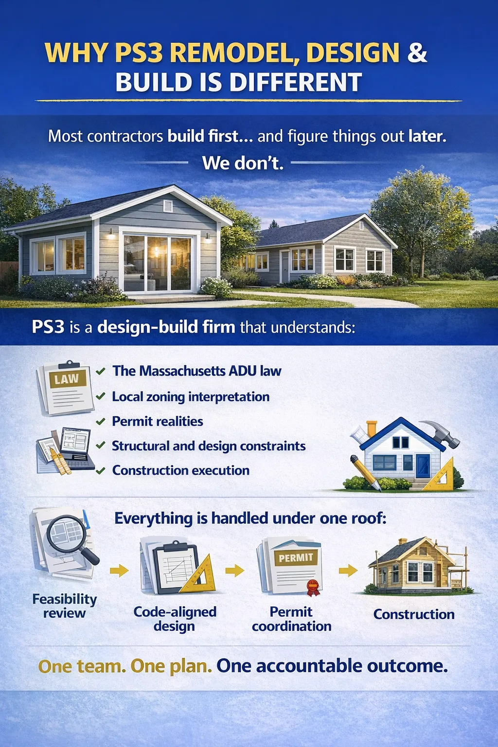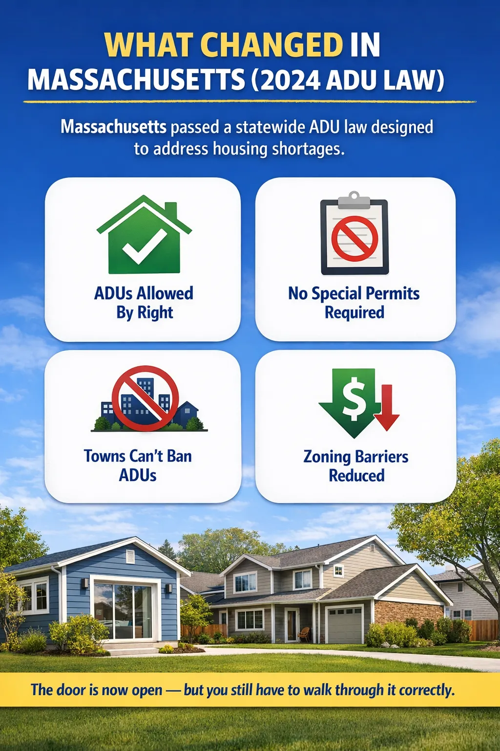 Because of a new Massachusetts ADU law, your property may now allow a legal second living unit — rental income, added value, and long-term flexibility — without rezoning.